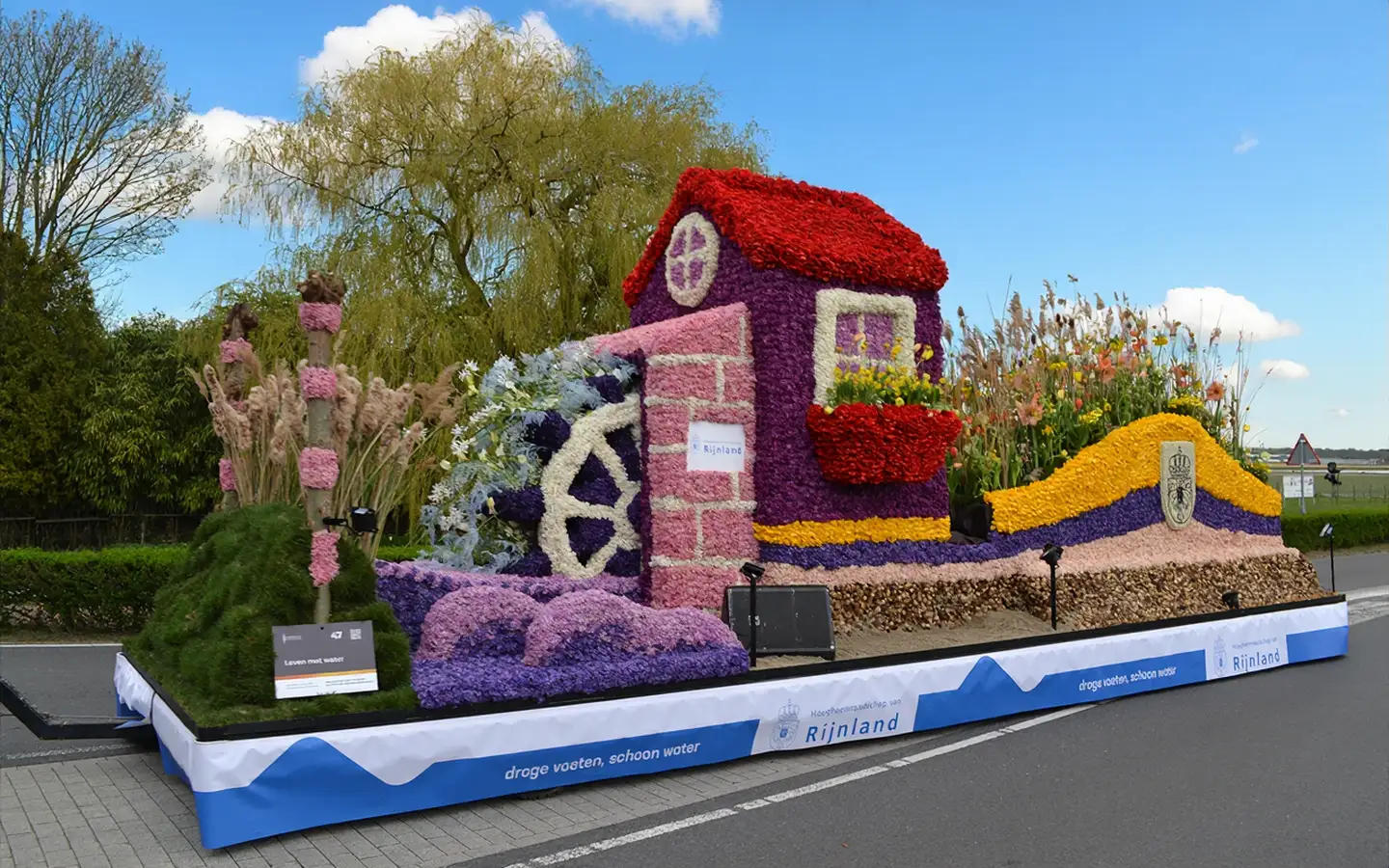 The Bloemencorso Bollenstreek flower parade passes through several municipalities where Rijnland is active. This parade float shows what this work entails and why water management is essential. Dikes and dunes provide protection against flooding, while the main pumping station regulates water levels and maintains good water quality. Work on this has continued day and night since 1255.